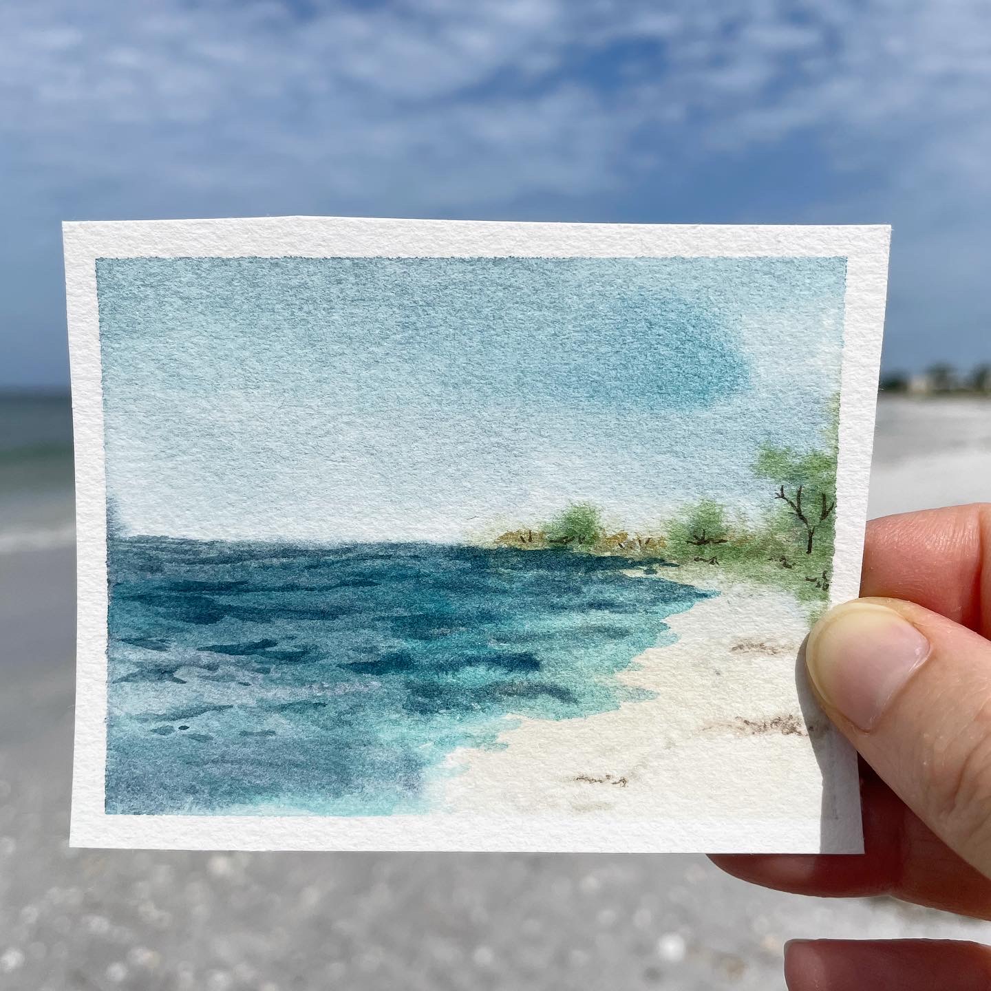 In this case, I wanted to focus on the amazing colors of the water and the sky, and the fuzzy looking vegetation on the horizon. It seemed too simple as I started to paint, and I was afraid they would be boring! I’m really happy with how it turned out, though– I love the texture of the watercolor with those beachy blues!