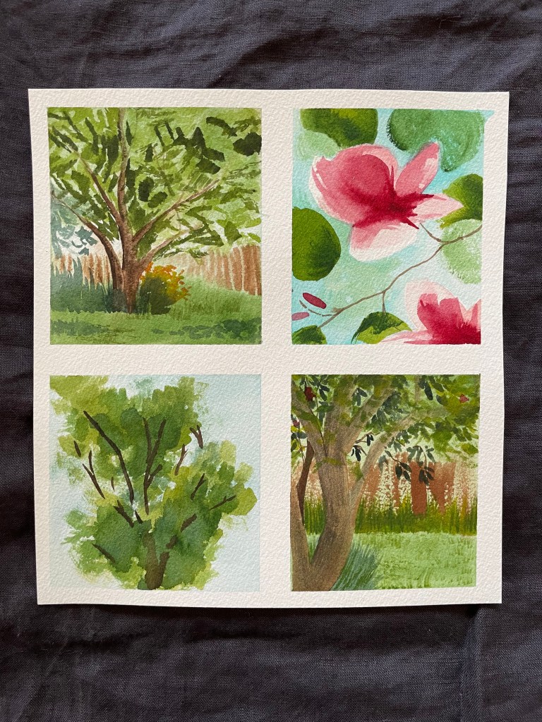 I’ve been liking how painting small helps me finish a painting more quickly, and not get bogged down in too many details. I bought a 4×6 inch block (Fluid cold press), and used that a lot this month. I also ventured a bit bigger on a few occasions– 6×6 and 9×6 inches!
