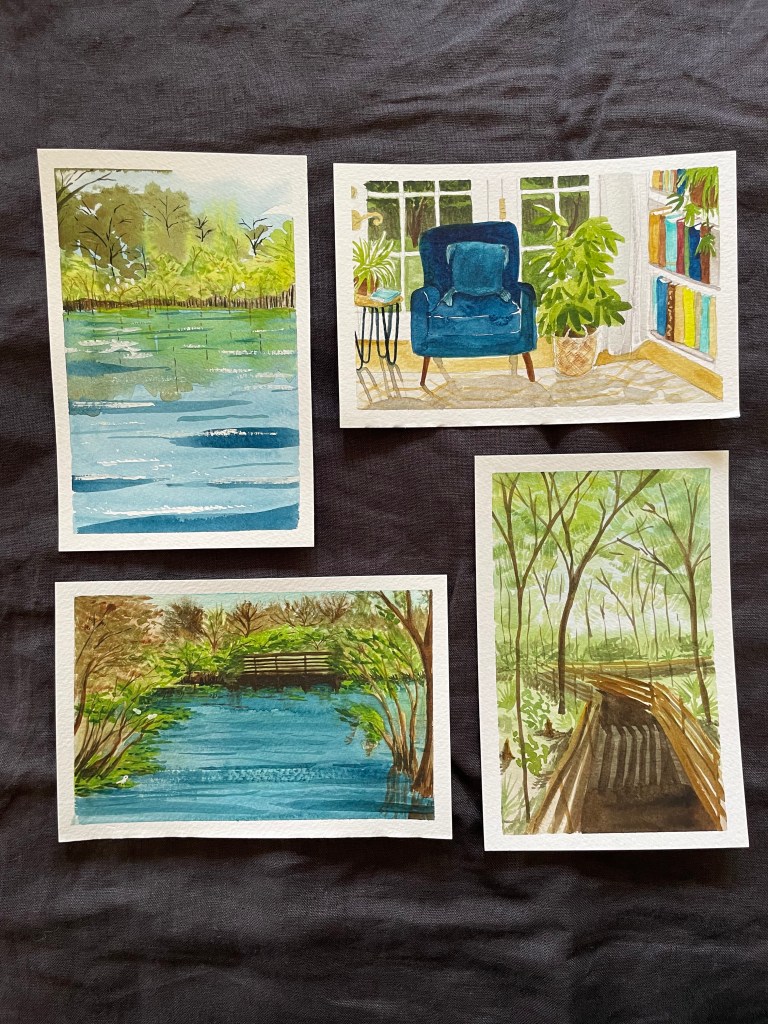 I can’t believe that I was able to paint outside almost every day in January! Here are my favorites from this month. I ended up with pictures of my backyard (the orchid tree is blooming!), a nearby lake, Lettuce Lake park (my favorite spot this month!), and just one interior that I did on a rainy day.