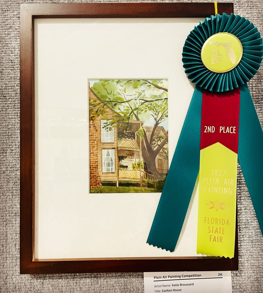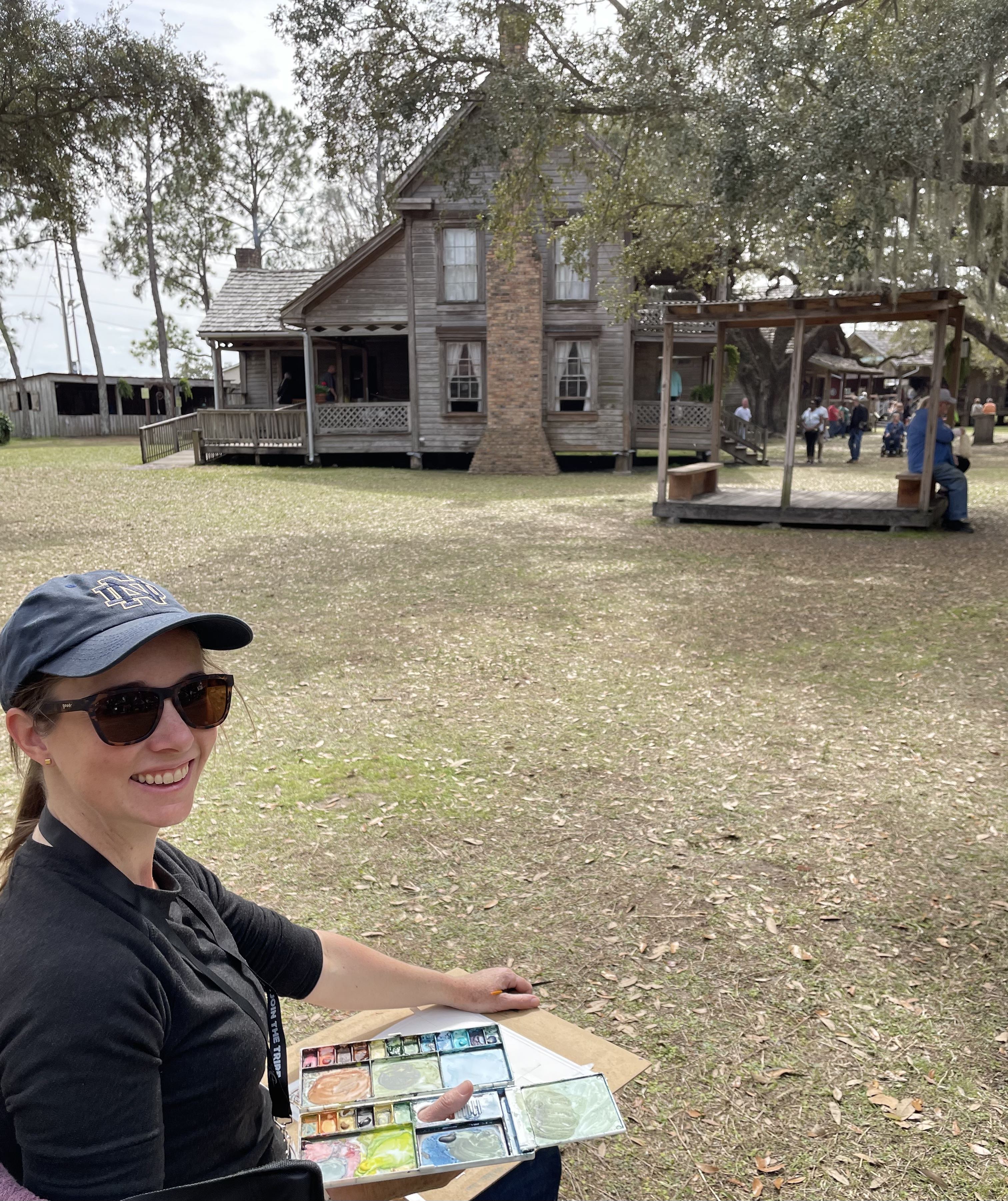 I’ve been enjoying plein air painting (literally, “open air” painting– popularized by the Impressionists to capture the light at a particular time and place) lately, and so I signed up to be part of the plein air painting competition at the Florida State Fair. I wasn’t sure what to expect (would I be painting a ferris wheel? Fried twinkies?), but I discovered a lovely “living history” village within the state fair, composed of historic homes, a post office, black smith shop, and other structures that had been collected over time for educational purposes. I fell in love with the view of Carlton House, which was the governor’s mansion in the 1800s, tucked under some enormous oak trees, and so I set up shop there!