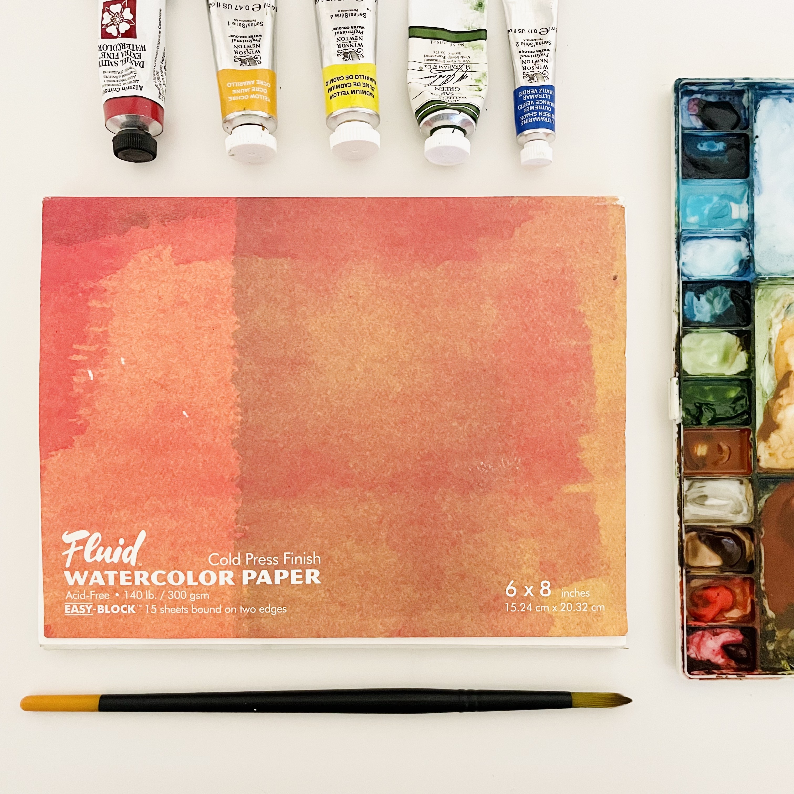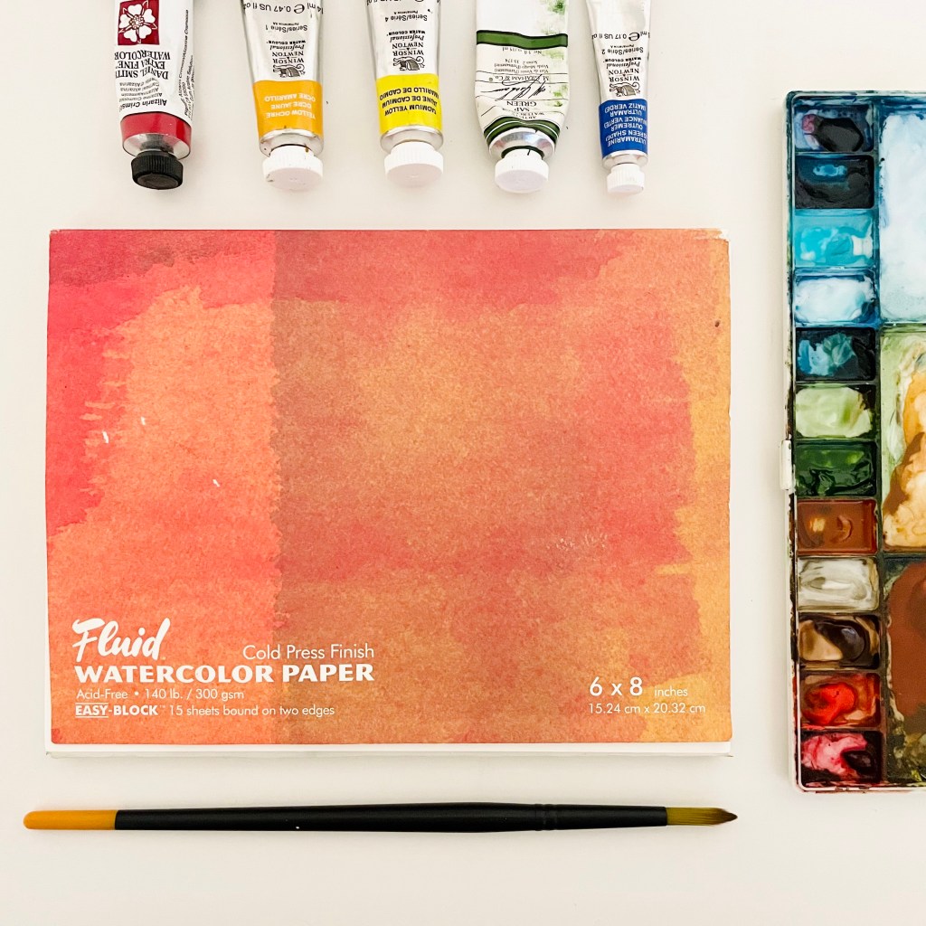 - Paper: these watercolor blocks from Fluid are so great! The paper is attached at the top and bottom, so the paper doesn’t curl up while you’re painting, and you can peel it off easily once it’s dry. Get the 6″ x 8″ size if you’re painting on the go, and the 9″ x 12″ size if you’re painting at home.