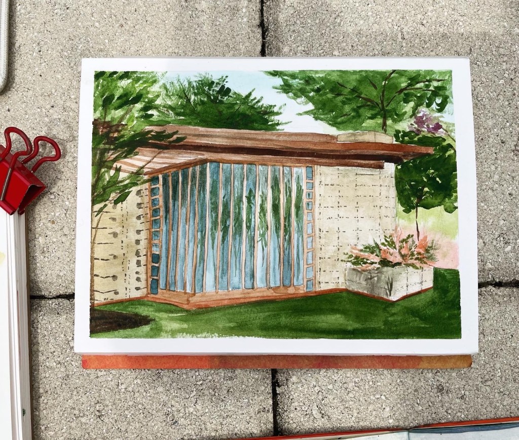 I joined Urban Sketchers Orlando at the campus of Florida Southern College for their Frank Lloyd Wright tour. Frank Lloyd Wright designed many of the buildings on campus in the 1940s– two churches, a huge dome fountain, covered walking paths, and even the planetarium!