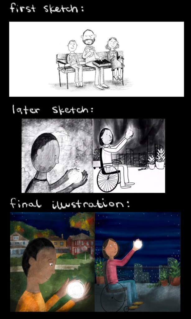 Final illustration: I love to paint night scenes! Fun facts: the houses on the left page are inspired by the architecture in Oak Park, a suburb of Chicago.