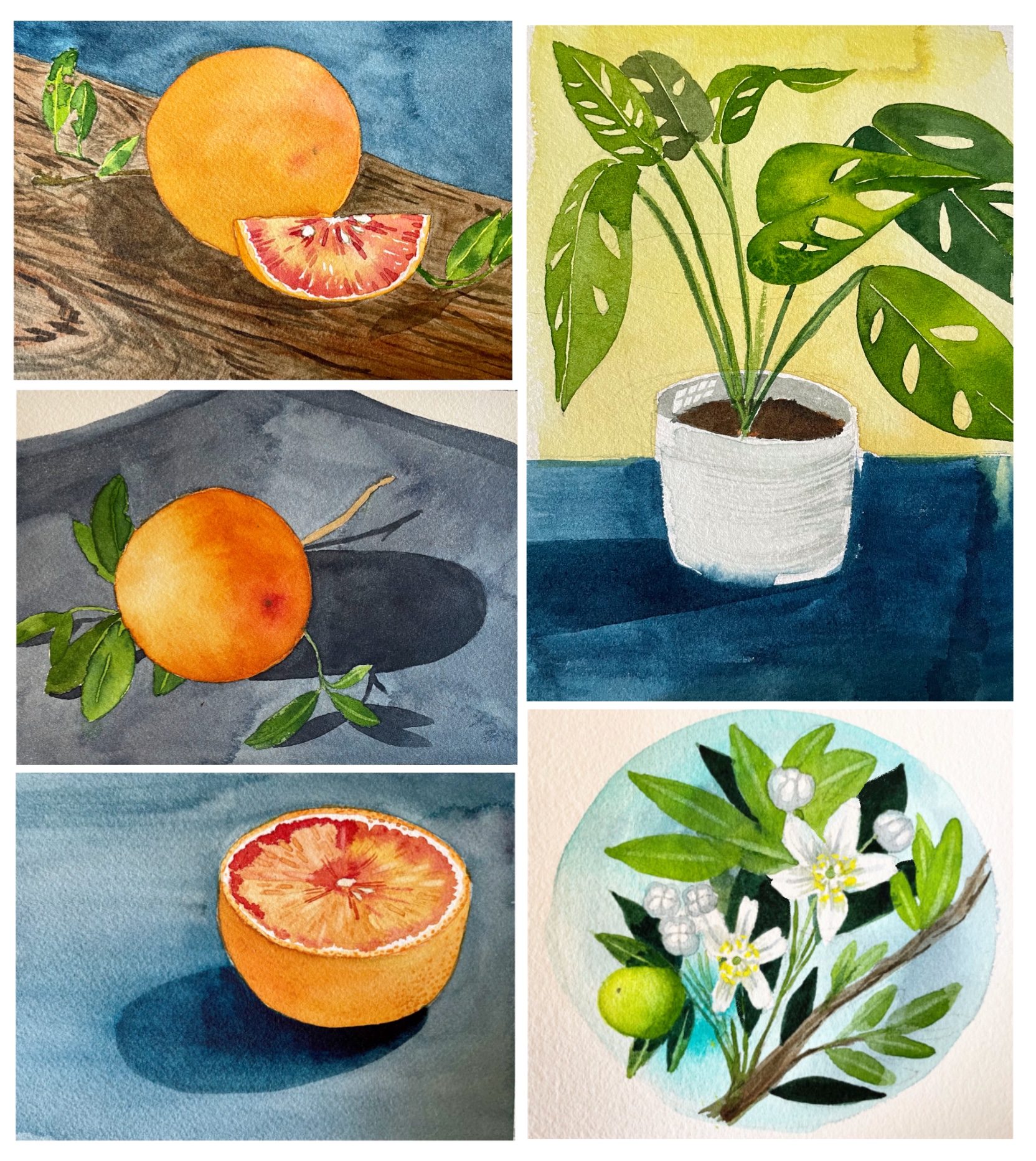 I think this is my favorite of the citrus paintings so far. I really like how the wood grain looks. Not sure about the angle of the cutting board– does it make the composition look a bit unbalanced? It’s making me a little nervous.