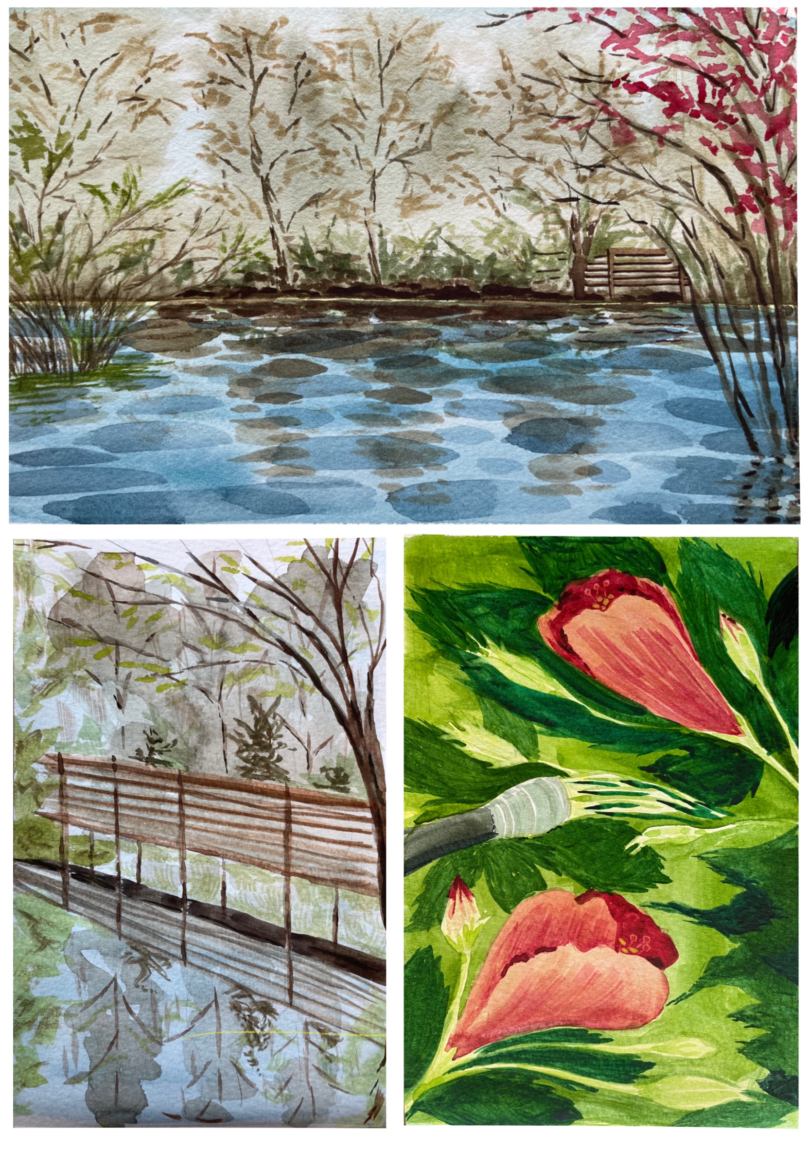 Painting along the boardwalk in one of my favorite parks– the cypress trees are starting to get new leaves, and there’s even some red foliage.